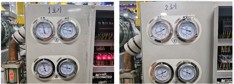 아울러, 빙축열설비 자동제어시스템이나 스크류 냉동기 본체의 제어패널에 야간 제빙운전과 주간 냉동기-축열조 병렬운전시의 냉동기 운전온도를 조절하는 메뉴가 없는 상태인데, 이에 따라 주간에 축열조와 냉동기가 병렬운전하는 상황에서도 냉동기가 제빙운전조건인 –4.5 ℃로 가동되고 있어 불필요한 에너지 낭비의 요인이 되고 있음 (냉동기들은 운전온도가 낮을수록 효율이 낮아져 가동시 더 많은 동력비가 소요되게 되므로, 빙축열용 냉동기의 주간 병렬운전시에는 5~7℃ 정도로 운전온도가 자동 전환되는 제어 메뉴나 기능이 있어야 함)
