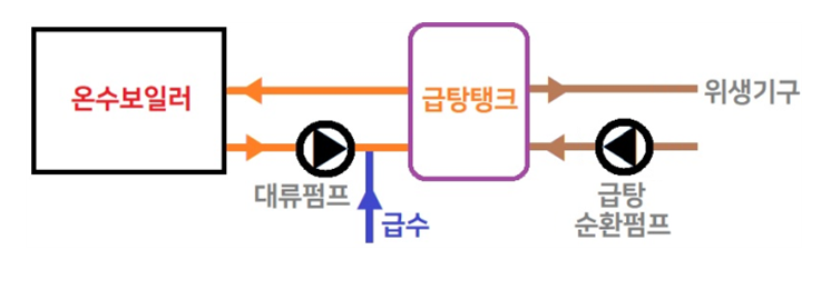 - 온수보일러와 급탕탱크(저탕탱크)가 현재 아래의 그림과 같이 연결되어 있으나, 대류펌프의 용량(유량)이 작아 급탕 동시사용량이 많을 경우 온수보일러에서 충분한 양의 급탕 공급이 어려울 수 있고 이로 인해 일시적으로 낮은 온도의 급탕 공급 등 급탕 온도의 헌팅현상이 발생될 우려가 있음